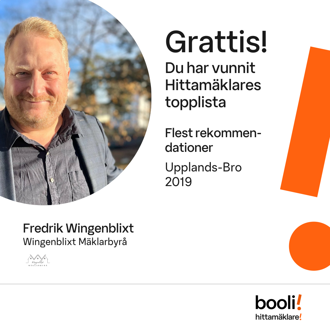 Statistik för publicerade bostäder, försäljningar och omdömen baseras på data från Booli. Statistiken för försäljningar avser inrapporterade och verifierade slutpriser från mäklare eller av Booli inhämtade och verifierade slutpriser. Statistiken för publicerade bostäder baseras på information som publicerats på Booli.se. Statistik för omdömen och rekommendationer baseras på omdömen från säljare som lämnats via Booli.