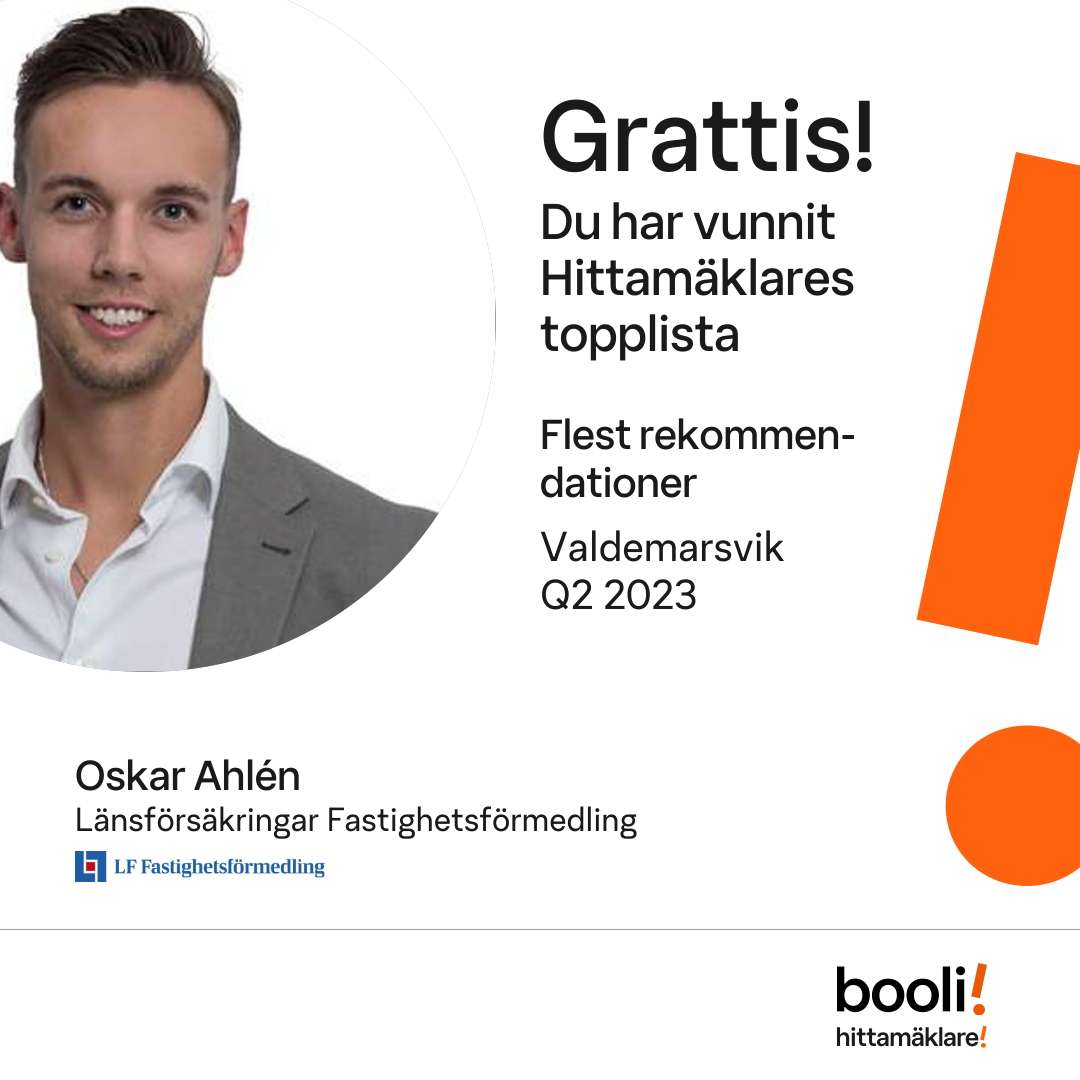 Statistik för publicerade bostäder, försäljningar och omdömen baseras på data från Booli och Hittamäklare. Statistiken för försäljningar avser inrapporterade och verifierade slutpriser från mäklare eller av Booli inhämtade och verifierade slutpriser. Statistiken för publicerade bostäder baseras på information som publicerats på Booli.se. Statistik för omdömen och rekommendationer baseras på omdömen från säljare som lämnats via Booli och Hittamäklare.