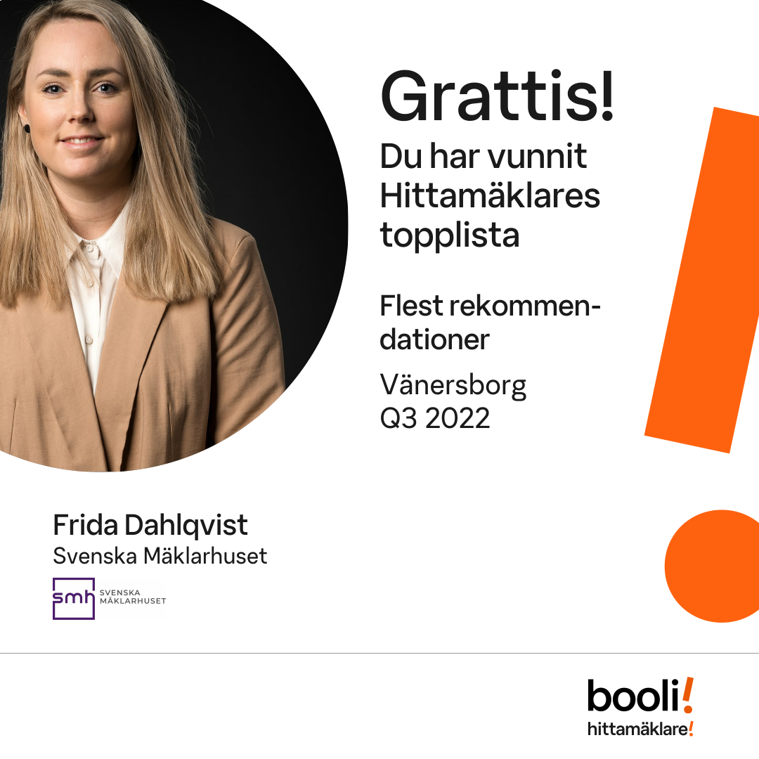 Statistik för publicerade bostäder, försäljningar och omdömen baseras på data från Booli och Hittamäklare. Statistiken för försäljningar avser inrapporterade och verifierade slutpriser från mäklare eller av Booli inhämtade och verifierade slutpriser. Statistiken för publicerade bostäder baseras på information som publicerats på Booli.se. Statistik för omdömen och rekommendationer baseras på omdömen från säljare som lämnats via Booli och Hittamäklare.