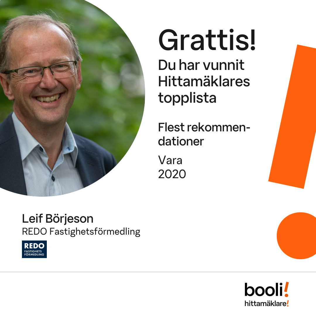Statistik för publicerade bostäder, försäljningar och omdömen baseras på data från Booli och Hittamäklare. Statistiken för försäljningar avser inrapporterade och verifierade slutpriser från mäklare eller av Booli inhämtade och verifierade slutpriser. Statistiken för publicerade bostäder baseras på information som publicerats på Booli.se. Statistik för omdömen och rekommendationer baseras på omdömen från säljare som lämnats via Booli och Hittamäklare.