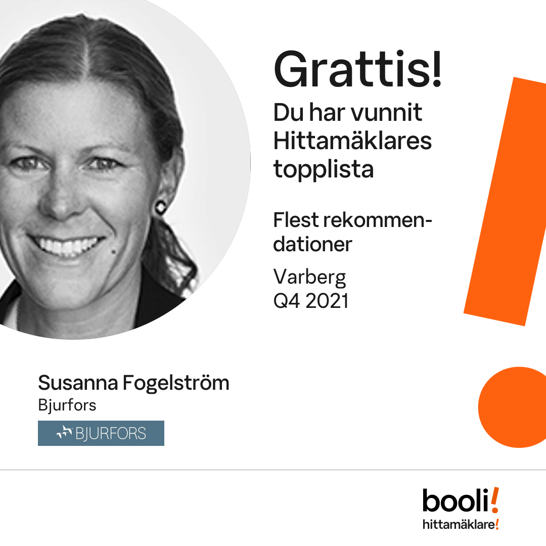 Statistik för publicerade bostäder, försäljningar och omdömen baseras på data från Booli och Hittamäklare. Statistiken för försäljningar avser inrapporterade och verifierade slutpriser från mäklare eller av Booli inhämtade och verifierade slutpriser. Statistiken för publicerade bostäder baseras på information som publicerats på Booli.se. Statistik för omdömen och rekommendationer baseras på omdömen från säljare som lämnats via Booli och Hittamäklare.