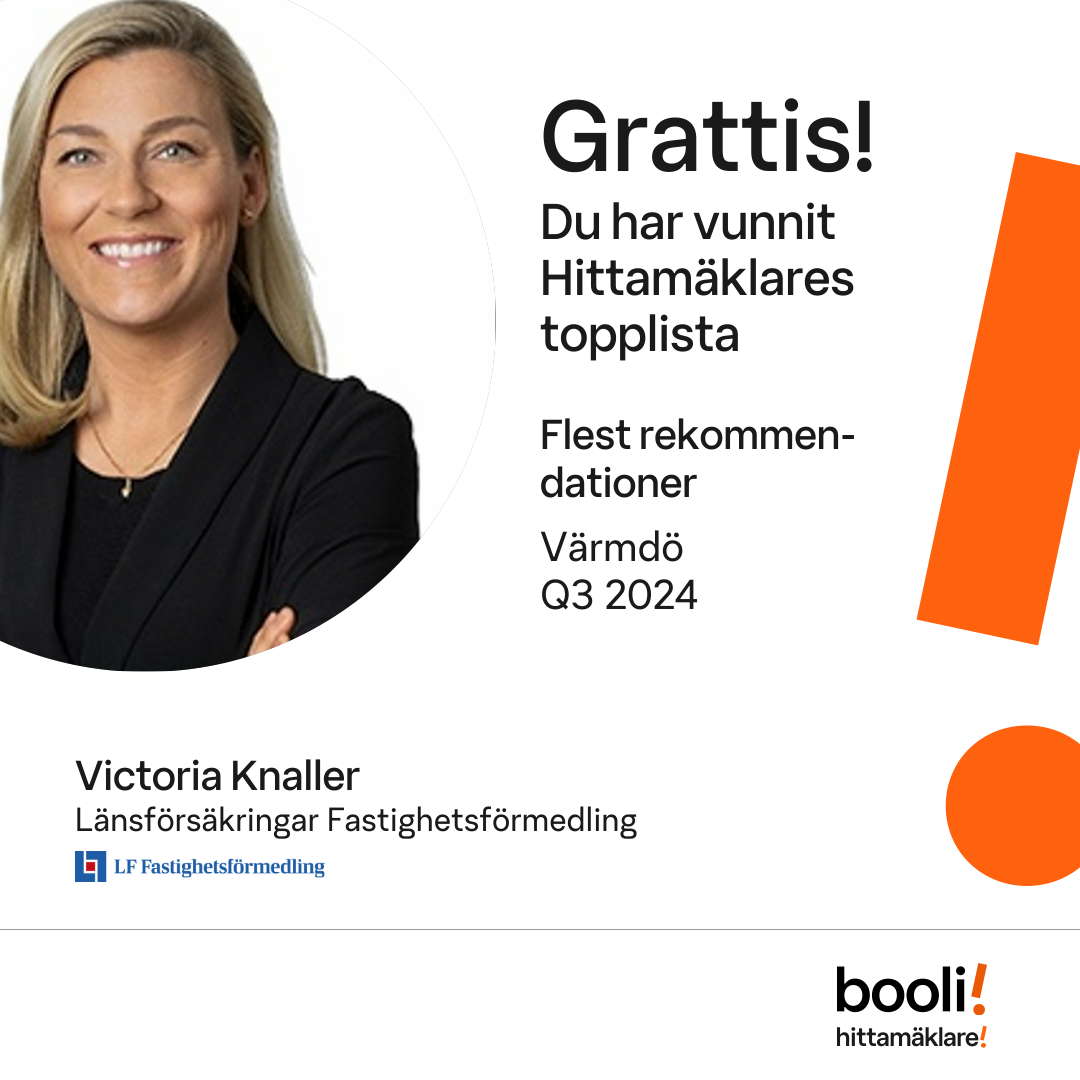 Statistik för publicerade bostäder, försäljningar och omdömen baseras på data från Booli och Hittamäklare. Statistiken för försäljningar avser inrapporterade och verifierade slutpriser från mäklare eller av Booli inhämtade och verifierade slutpriser. Statistiken för publicerade bostäder baseras på information som publicerats på Booli.se. Statistik för omdömen och rekommendationer baseras på omdömen från säljare som lämnats via Booli och Hittamäklare.