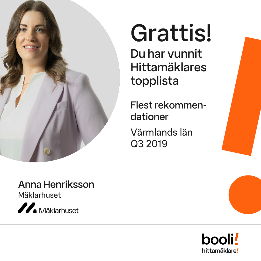 Statistik för publicerade bostäder, försäljningar och omdömen baseras på data från Booli och Hittamäklare. Statistiken för försäljningar avser inrapporterade och verifierade slutpriser från mäklare eller av Booli inhämtade och verifierade slutpriser. Statistiken för publicerade bostäder baseras på information som publicerats på Booli.se. Statistik för omdömen och rekommendationer baseras på omdömen från säljare som lämnats via Booli och Hittamäklare.
