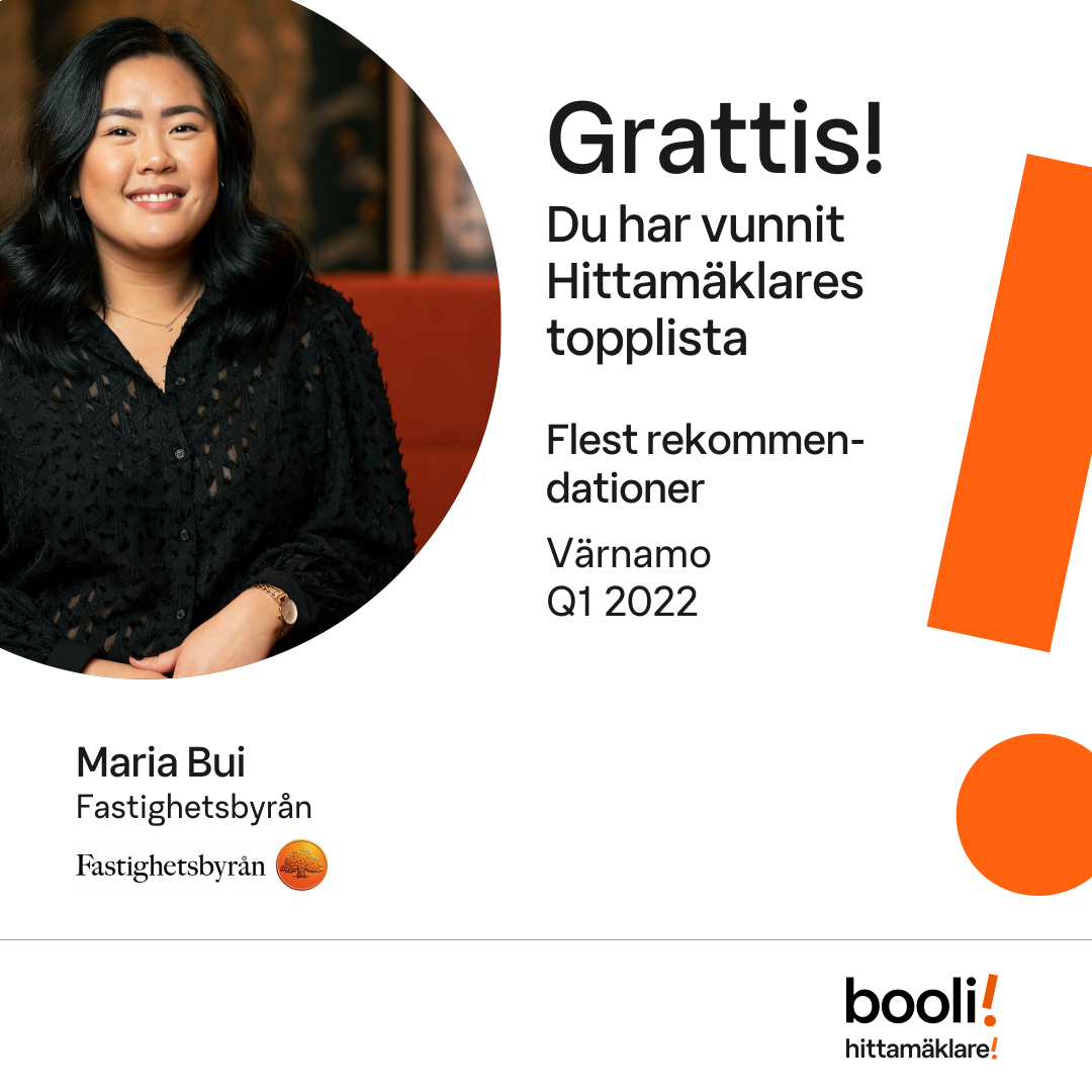 Statistik för publicerade bostäder, försäljningar och omdömen baseras på data från Booli och Hittamäklare. Statistiken för försäljningar avser inrapporterade och verifierade slutpriser från mäklare eller av Booli inhämtade och verifierade slutpriser. Statistiken för publicerade bostäder baseras på information som publicerats på Booli.se. Statistik för omdömen och rekommendationer baseras på omdömen från säljare som lämnats via Booli och Hittamäklare.