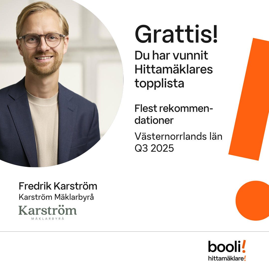 Statistik för publicerade bostäder, försäljningar och omdömen baseras på data från Booli och Hittamäklare. Statistiken för försäljningar avser inrapporterade och verifierade slutpriser från mäklare eller av Booli inhämtade och verifierade slutpriser. Statistiken för publicerade bostäder baseras på information som publicerats på Booli.se. Statistik för omdömen och rekommendationer baseras på omdömen från säljare som lämnats via Booli och Hittamäklare.