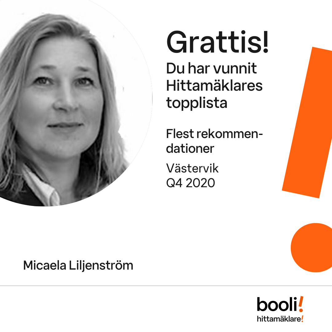 Statistik för publicerade bostäder, försäljningar och omdömen baseras på data från Booli och Hittamäklare. Statistiken för försäljningar avser inrapporterade och verifierade slutpriser från mäklare eller av Booli inhämtade och verifierade slutpriser. Statistiken för publicerade bostäder baseras på information som publicerats på Booli.se. Statistik för omdömen och rekommendationer baseras på omdömen från säljare som lämnats via Booli och Hittamäklare.