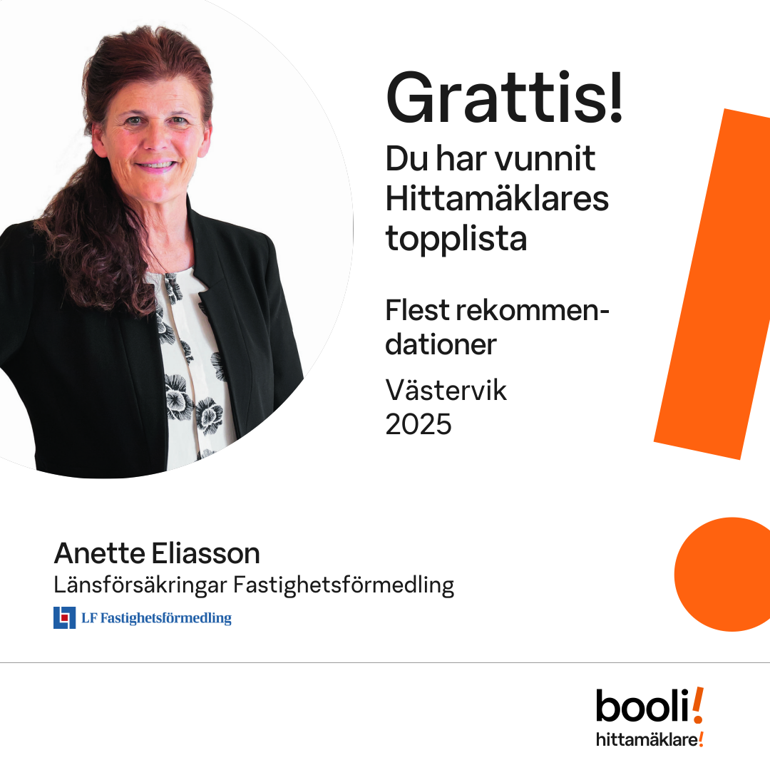 Statistik för publicerade bostäder, försäljningar och omdömen baseras på data från Booli och Hittamäklare. Statistiken för försäljningar avser inrapporterade och verifierade slutpriser från mäklare eller av Booli inhämtade och verifierade slutpriser. Statistiken för publicerade bostäder baseras på information som publicerats på Booli.se. Statistik för omdömen och rekommendationer baseras på omdömen från säljare som lämnats via Booli och Hittamäklare.