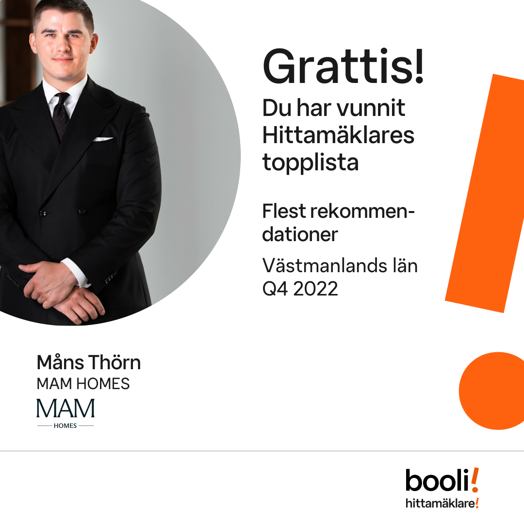 Statistik för publicerade bostäder, försäljningar och omdömen baseras på data från Booli och Hittamäklare. Statistiken för försäljningar avser inrapporterade och verifierade slutpriser från mäklare eller av Booli inhämtade och verifierade slutpriser. Statistiken för publicerade bostäder baseras på information som publicerats på Booli.se. Statistik för omdömen och rekommendationer baseras på omdömen från säljare som lämnats via Booli och Hittamäklare.