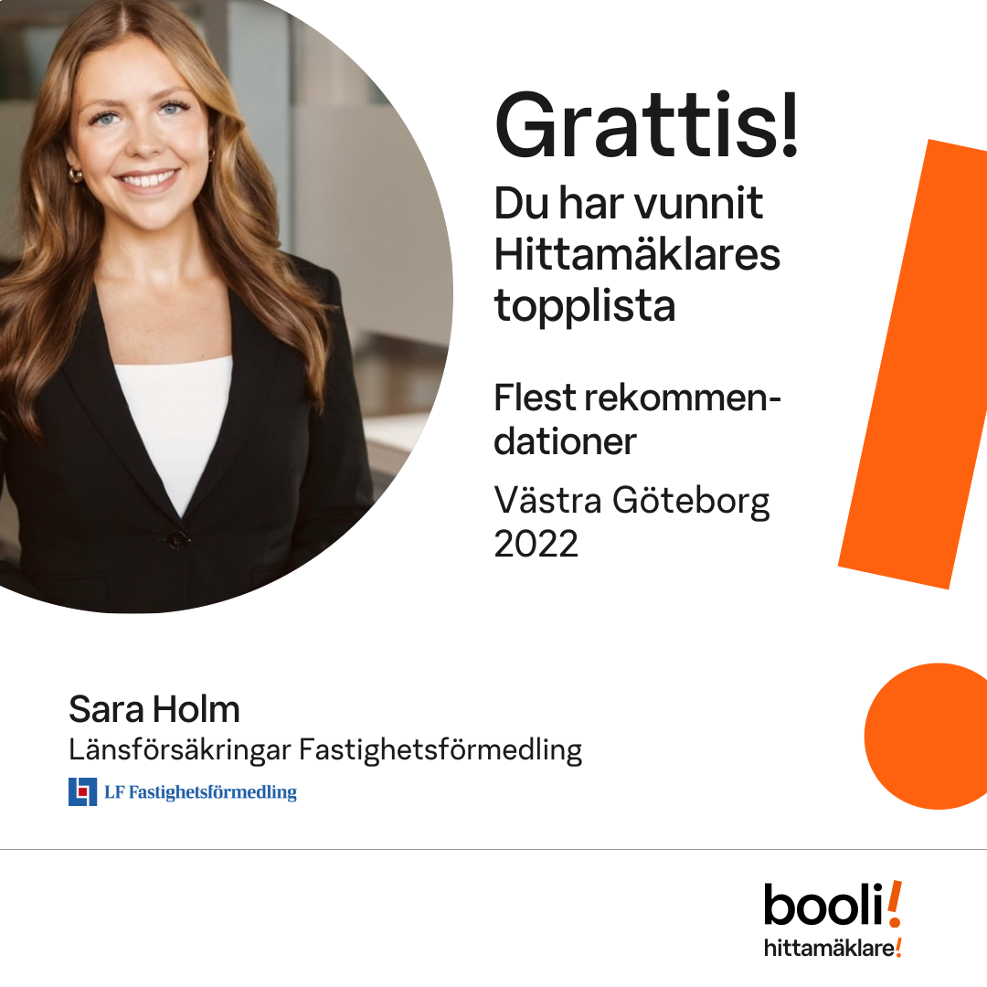 Statistik för publicerade bostäder, försäljningar och omdömen baseras på data från Booli och Hittamäklare. Statistiken för försäljningar avser inrapporterade och verifierade slutpriser från mäklare eller av Booli inhämtade och verifierade slutpriser. Statistiken för publicerade bostäder baseras på information som publicerats på Booli.se. Statistik för omdömen och rekommendationer baseras på omdömen från säljare som lämnats via Booli och Hittamäklare.