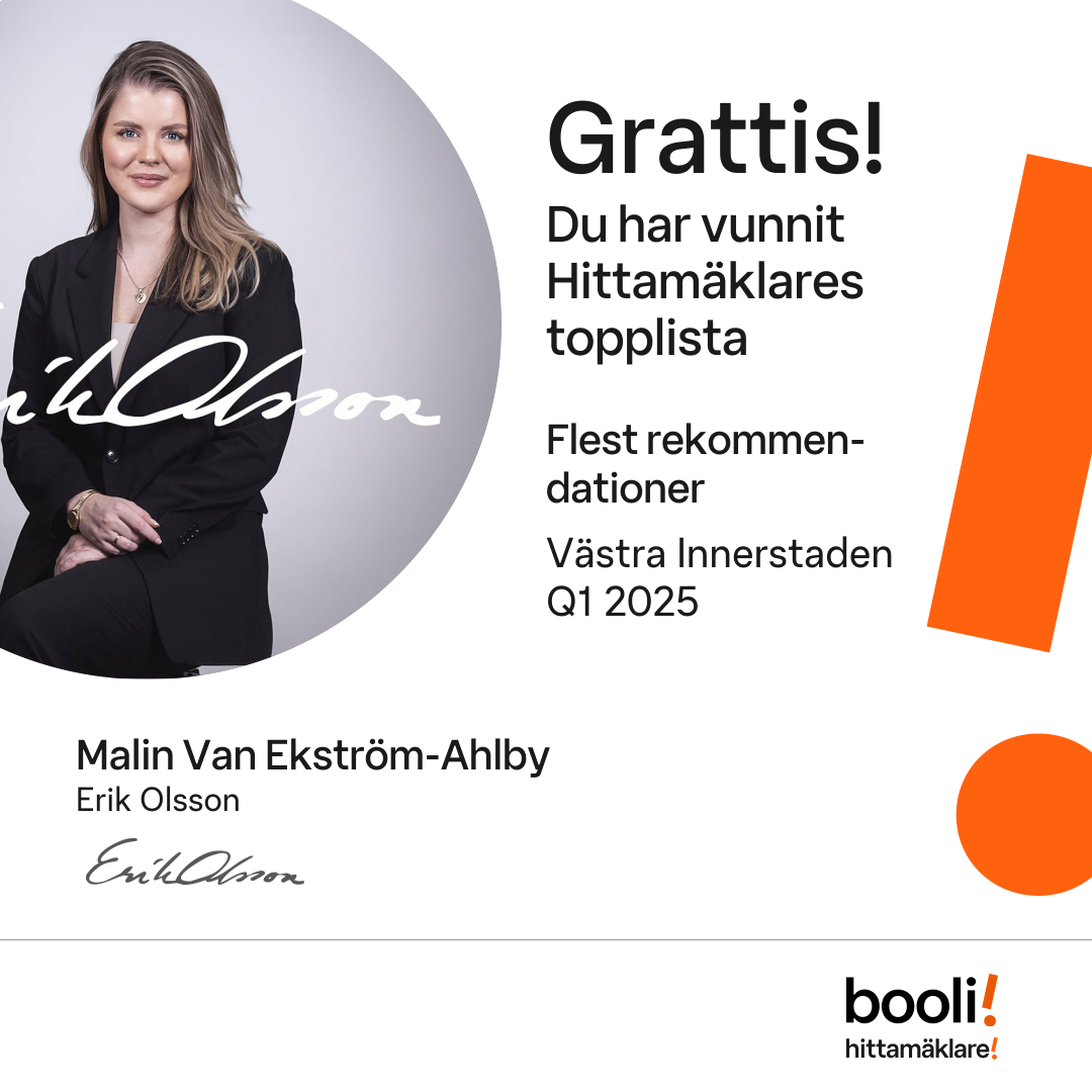 Statistik för publicerade bostäder, försäljningar och omdömen baseras på data från Booli och Hittamäklare. Statistiken för försäljningar avser inrapporterade och verifierade slutpriser från mäklare eller av Booli inhämtade och verifierade slutpriser. Statistiken för publicerade bostäder baseras på information som publicerats på Booli.se. Statistik för omdömen och rekommendationer baseras på omdömen från säljare som lämnats via Booli och Hittamäklare.