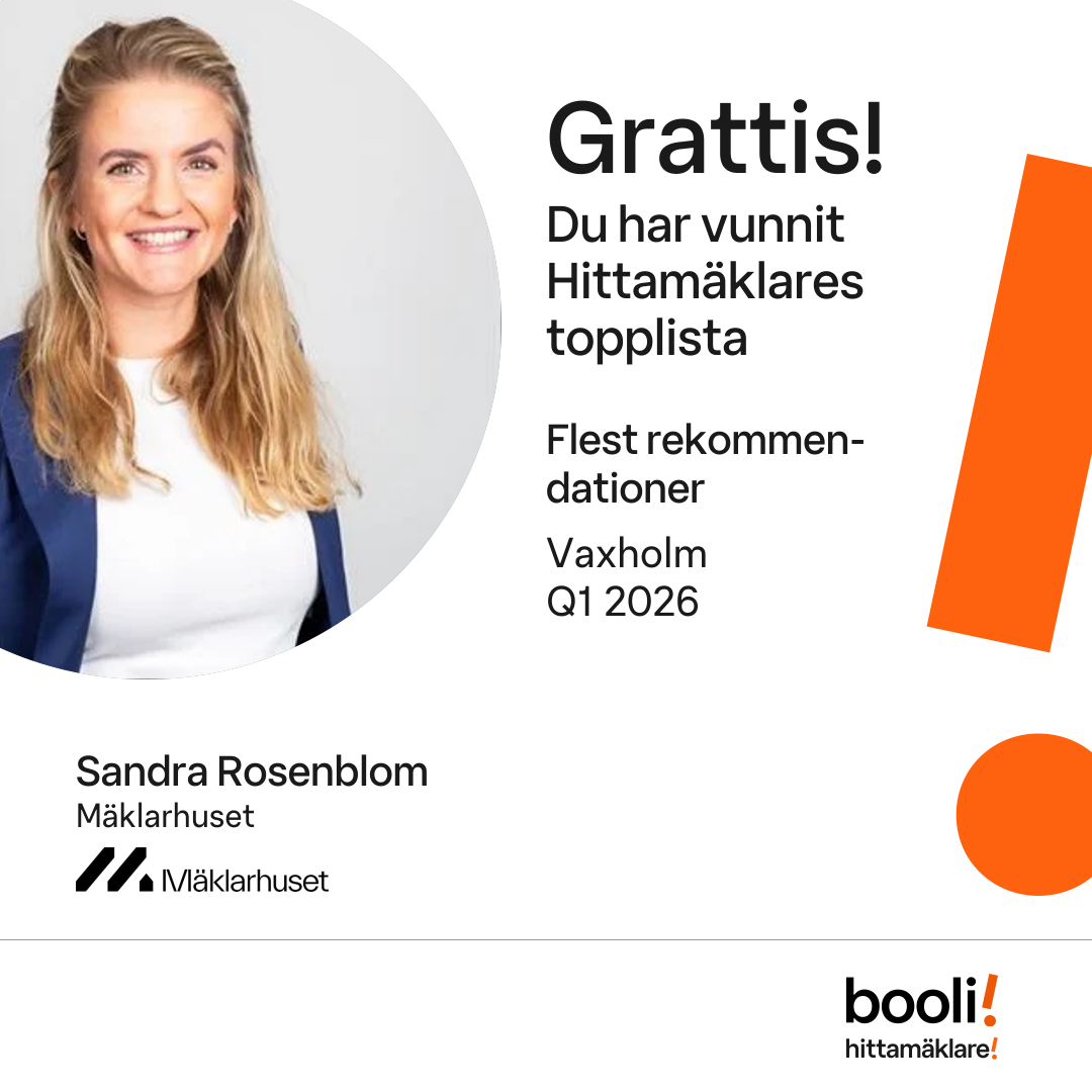 Statistik för publicerade bostäder, försäljningar och omdömen baseras på data från Booli. Statistiken för försäljningar avser inrapporterade och verifierade slutpriser från mäklare eller av Booli inhämtade och verifierade slutpriser. Statistiken för publicerade bostäder baseras på information som publicerats på Booli.se. Statistik för omdömen och rekommendationer baseras på omdömen från säljare som lämnats via Booli.