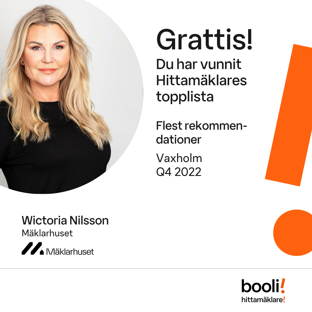 Statistik för publicerade bostäder, försäljningar och omdömen baseras på data från Booli och Hittamäklare. Statistiken för försäljningar avser inrapporterade och verifierade slutpriser från mäklare eller av Booli inhämtade och verifierade slutpriser. Statistiken för publicerade bostäder baseras på information som publicerats på Booli.se. Statistik för omdömen och rekommendationer baseras på omdömen från säljare som lämnats via Booli och Hittamäklare.