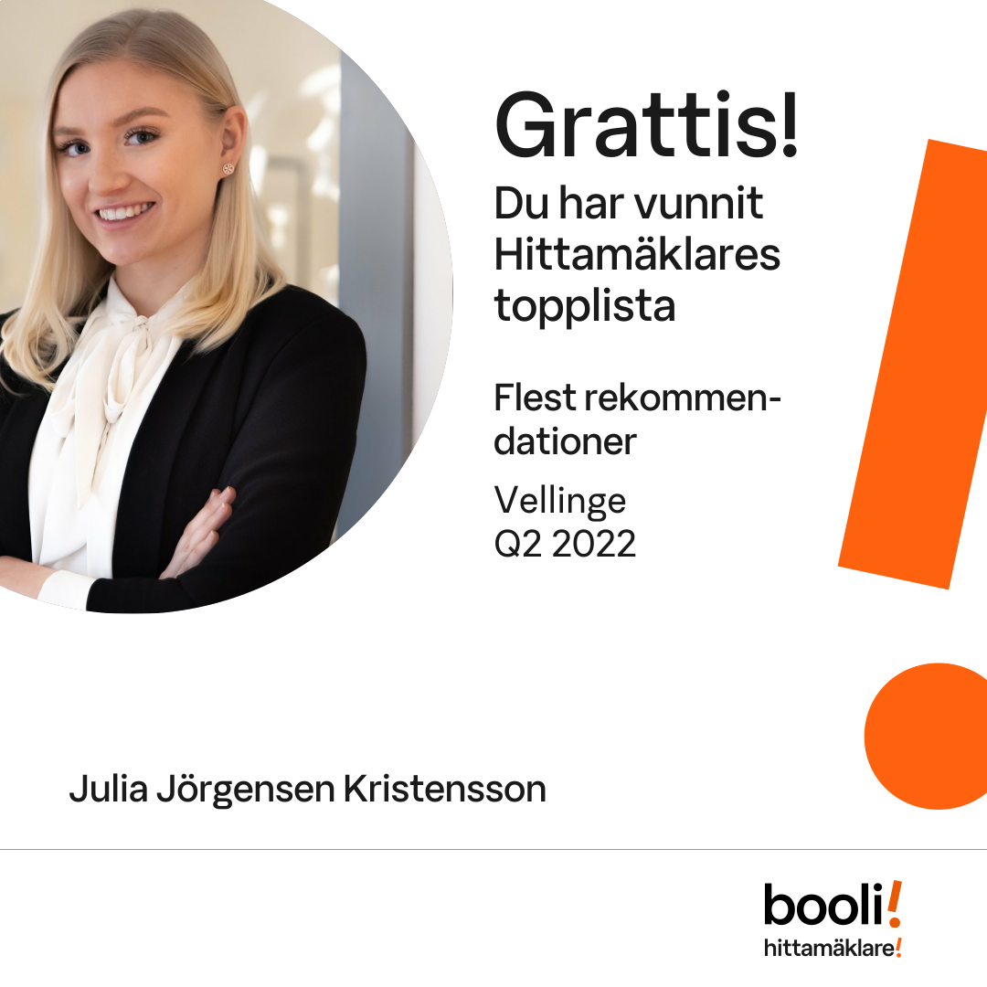 Statistik för publicerade bostäder, försäljningar och omdömen baseras på data från Booli. Statistiken för försäljningar avser inrapporterade och verifierade slutpriser från mäklare eller av Booli inhämtade och verifierade slutpriser. Statistiken för publicerade bostäder baseras på information som publicerats på Booli.se. Statistik för omdömen och rekommendationer baseras på omdömen från säljare som lämnats via Booli.