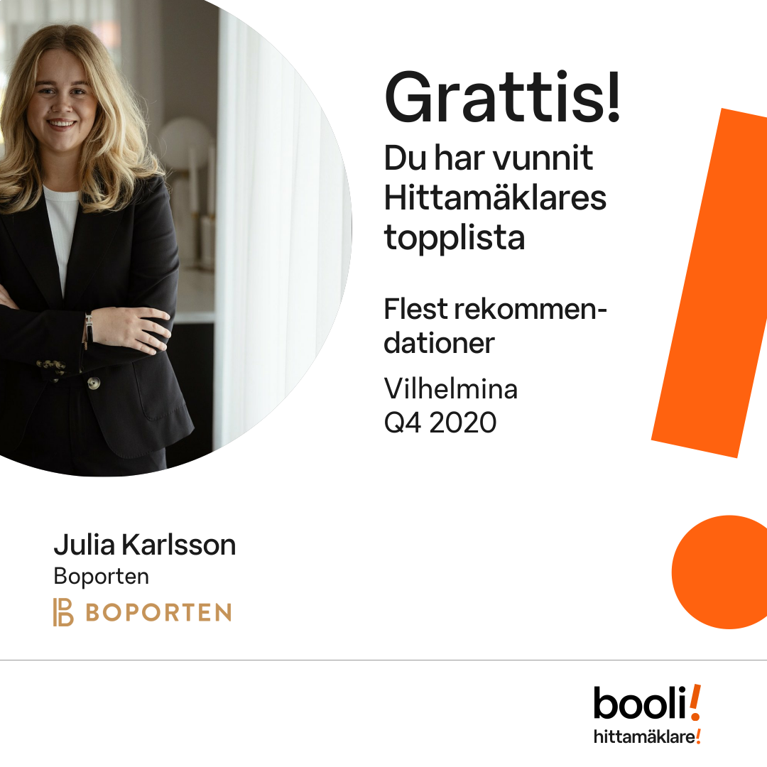 Statistik för publicerade bostäder, försäljningar och omdömen baseras på data från Booli och Hittamäklare. Statistiken för försäljningar avser inrapporterade och verifierade slutpriser från mäklare eller av Booli inhämtade och verifierade slutpriser. Statistiken för publicerade bostäder baseras på information som publicerats på Booli.se. Statistik för omdömen och rekommendationer baseras på omdömen från säljare som lämnats via Booli och Hittamäklare.