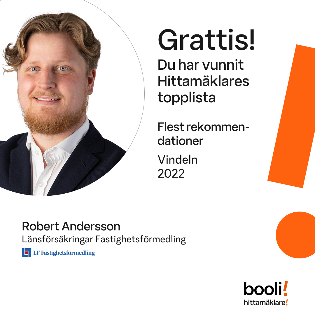 Statistik för publicerade bostäder, försäljningar och omdömen baseras på data från Booli. Statistiken för försäljningar avser inrapporterade och verifierade slutpriser från mäklare eller av Booli inhämtade och verifierade slutpriser. Statistiken för publicerade bostäder baseras på information som publicerats på Booli.se. Statistik för omdömen och rekommendationer baseras på omdömen från säljare som lämnats via Booli.