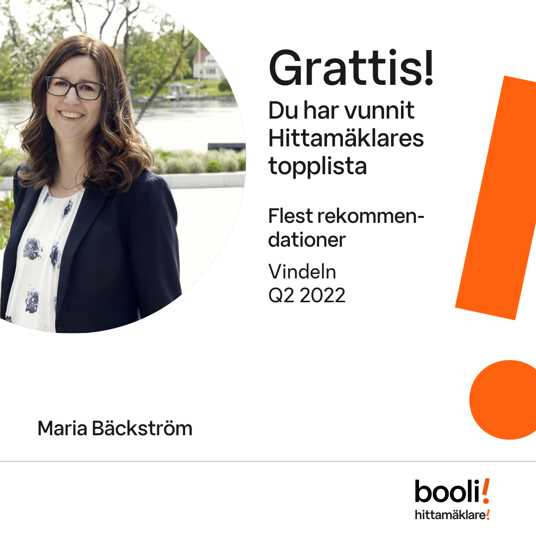 Statistik för publicerade bostäder, försäljningar och omdömen baseras på data från Booli och Hittamäklare. Statistiken för försäljningar avser inrapporterade och verifierade slutpriser från mäklare eller av Booli inhämtade och verifierade slutpriser. Statistiken för publicerade bostäder baseras på information som publicerats på Booli.se. Statistik för omdömen och rekommendationer baseras på omdömen från säljare som lämnats via Booli och Hittamäklare.