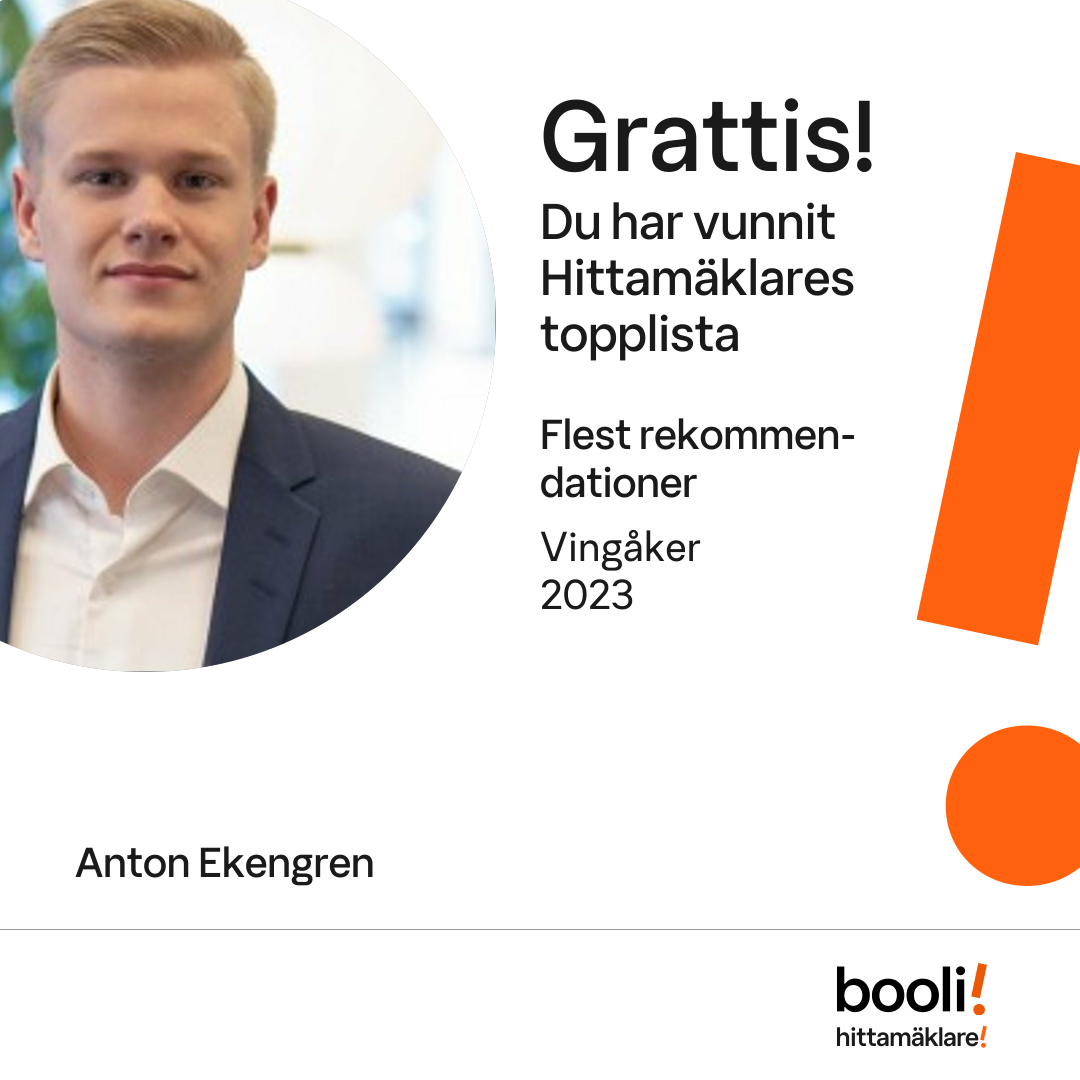 Statistik för publicerade bostäder, försäljningar och omdömen baseras på data från Booli och Hittamäklare. Statistiken för försäljningar avser inrapporterade och verifierade slutpriser från mäklare eller av Booli inhämtade och verifierade slutpriser. Statistiken för publicerade bostäder baseras på information som publicerats på Booli.se. Statistik för omdömen och rekommendationer baseras på omdömen från säljare som lämnats via Booli och Hittamäklare.