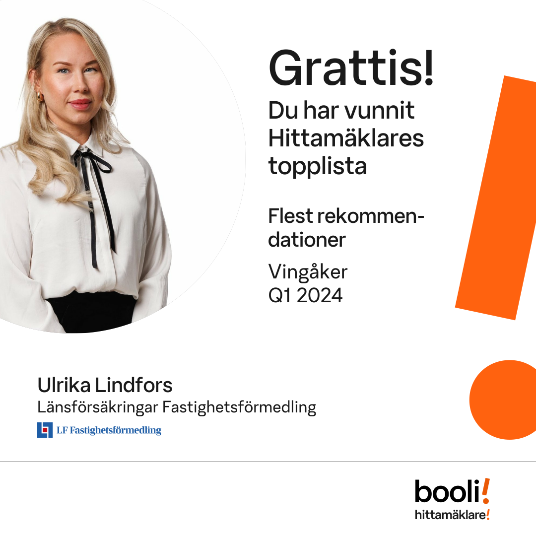 Statistik för publicerade bostäder, försäljningar och omdömen baseras på data från Booli och Hittamäklare. Statistiken för försäljningar avser inrapporterade och verifierade slutpriser från mäklare eller av Booli inhämtade och verifierade slutpriser. Statistiken för publicerade bostäder baseras på information som publicerats på Booli.se. Statistik för omdömen och rekommendationer baseras på omdömen från säljare som lämnats via Booli och Hittamäklare.
