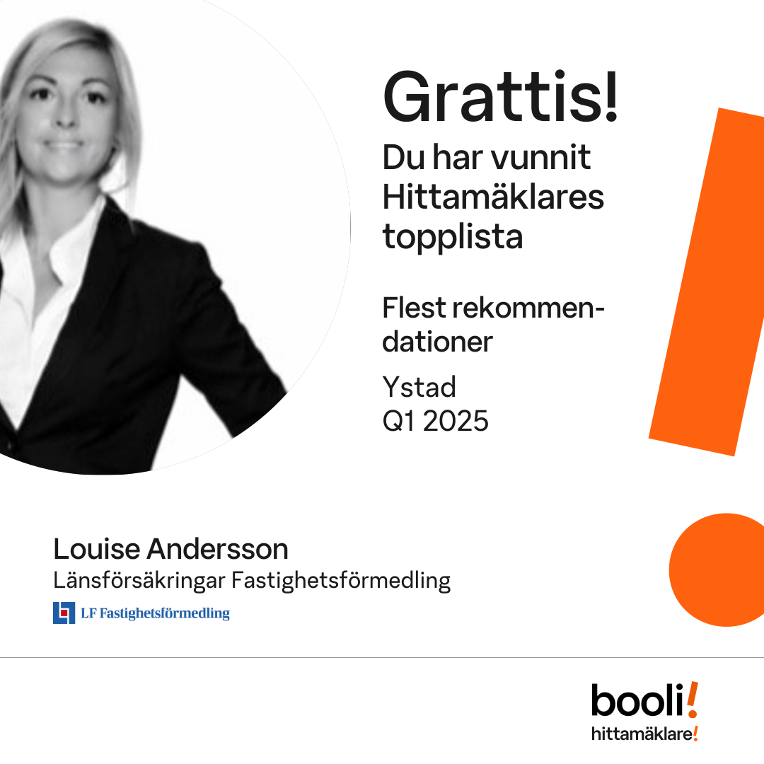Statistik för publicerade bostäder, försäljningar och omdömen baseras på data från Booli och Hittamäklare. Statistiken för försäljningar avser inrapporterade och verifierade slutpriser från mäklare eller av Booli inhämtade och verifierade slutpriser. Statistiken för publicerade bostäder baseras på information som publicerats på Booli.se. Statistik för omdömen och rekommendationer baseras på omdömen från säljare som lämnats via Booli och Hittamäklare.