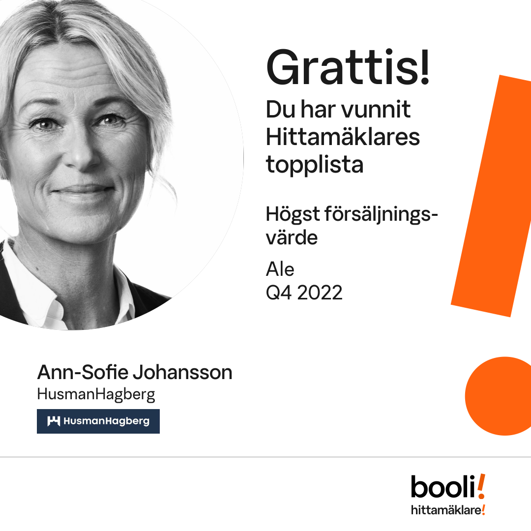 Statistik för publicerade bostäder, försäljningar och omdömen baseras på data från Booli och Hittamäklare. Statistiken för försäljningar avser inrapporterade och verifierade slutpriser från mäklare eller av Booli inhämtade och verifierade slutpriser. Statistiken för publicerade bostäder baseras på information som publicerats på Booli.se. Statistik för omdömen och rekommendationer baseras på omdömen från säljare som lämnats via Booli och Hittamäklare.