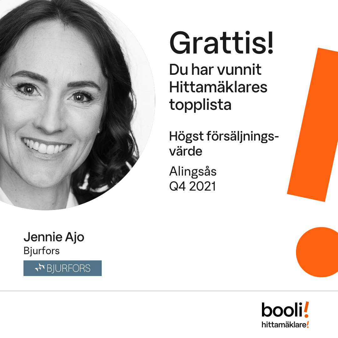 Statistik för publicerade bostäder, försäljningar och omdömen baseras på data från Booli och Hittamäklare. Statistiken för försäljningar avser inrapporterade och verifierade slutpriser från mäklare eller av Booli inhämtade och verifierade slutpriser. Statistiken för publicerade bostäder baseras på information som publicerats på Booli.se. Statistik för omdömen och rekommendationer baseras på omdömen från säljare som lämnats via Booli och Hittamäklare.