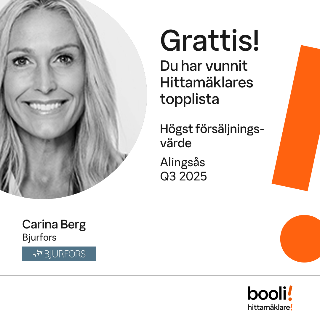 Statistik för publicerade bostäder, försäljningar och omdömen baseras på data från Booli och Hittamäklare. Statistiken för försäljningar avser inrapporterade och verifierade slutpriser från mäklare eller av Booli inhämtade och verifierade slutpriser. Statistiken för publicerade bostäder baseras på information som publicerats på Booli.se. Statistik för omdömen och rekommendationer baseras på omdömen från säljare som lämnats via Booli och Hittamäklare.