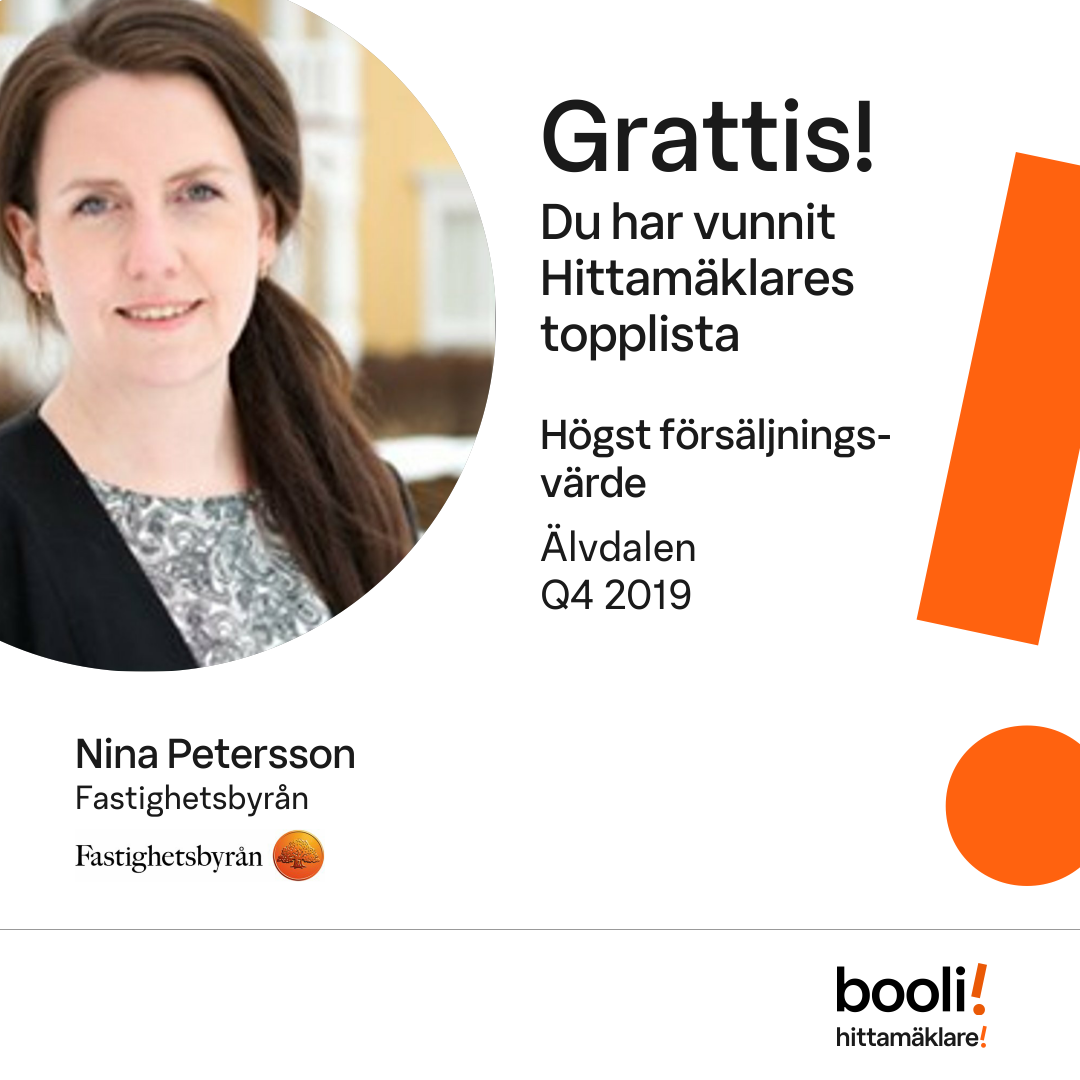 Statistik för publicerade bostäder, försäljningar och omdömen baseras på data från Booli och Hittamäklare. Statistiken för försäljningar avser inrapporterade och verifierade slutpriser från mäklare eller av Booli inhämtade och verifierade slutpriser. Statistiken för publicerade bostäder baseras på information som publicerats på Booli.se. Statistik för omdömen och rekommendationer baseras på omdömen från säljare som lämnats via Booli och Hittamäklare.