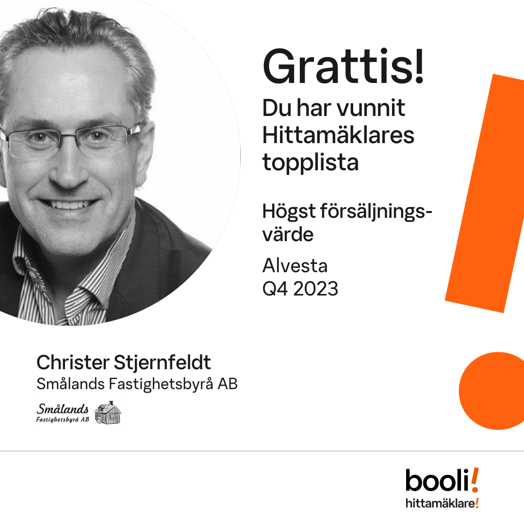 Statistik för publicerade bostäder, försäljningar och omdömen baseras på data från Booli och Hittamäklare. Statistiken för försäljningar avser inrapporterade och verifierade slutpriser från mäklare eller av Booli inhämtade och verifierade slutpriser. Statistiken för publicerade bostäder baseras på information som publicerats på Booli.se. Statistik för omdömen och rekommendationer baseras på omdömen från säljare som lämnats via Booli och Hittamäklare.