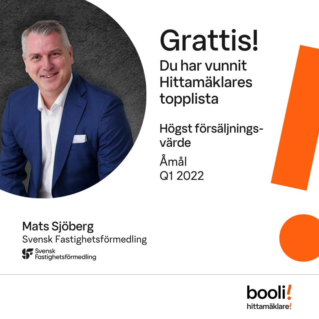 Statistik för publicerade bostäder, försäljningar och omdömen baseras på data från Booli och Hittamäklare. Statistiken för försäljningar avser inrapporterade och verifierade slutpriser från mäklare eller av Booli inhämtade och verifierade slutpriser. Statistiken för publicerade bostäder baseras på information som publicerats på Booli.se. Statistik för omdömen och rekommendationer baseras på omdömen från säljare som lämnats via Booli och Hittamäklare.