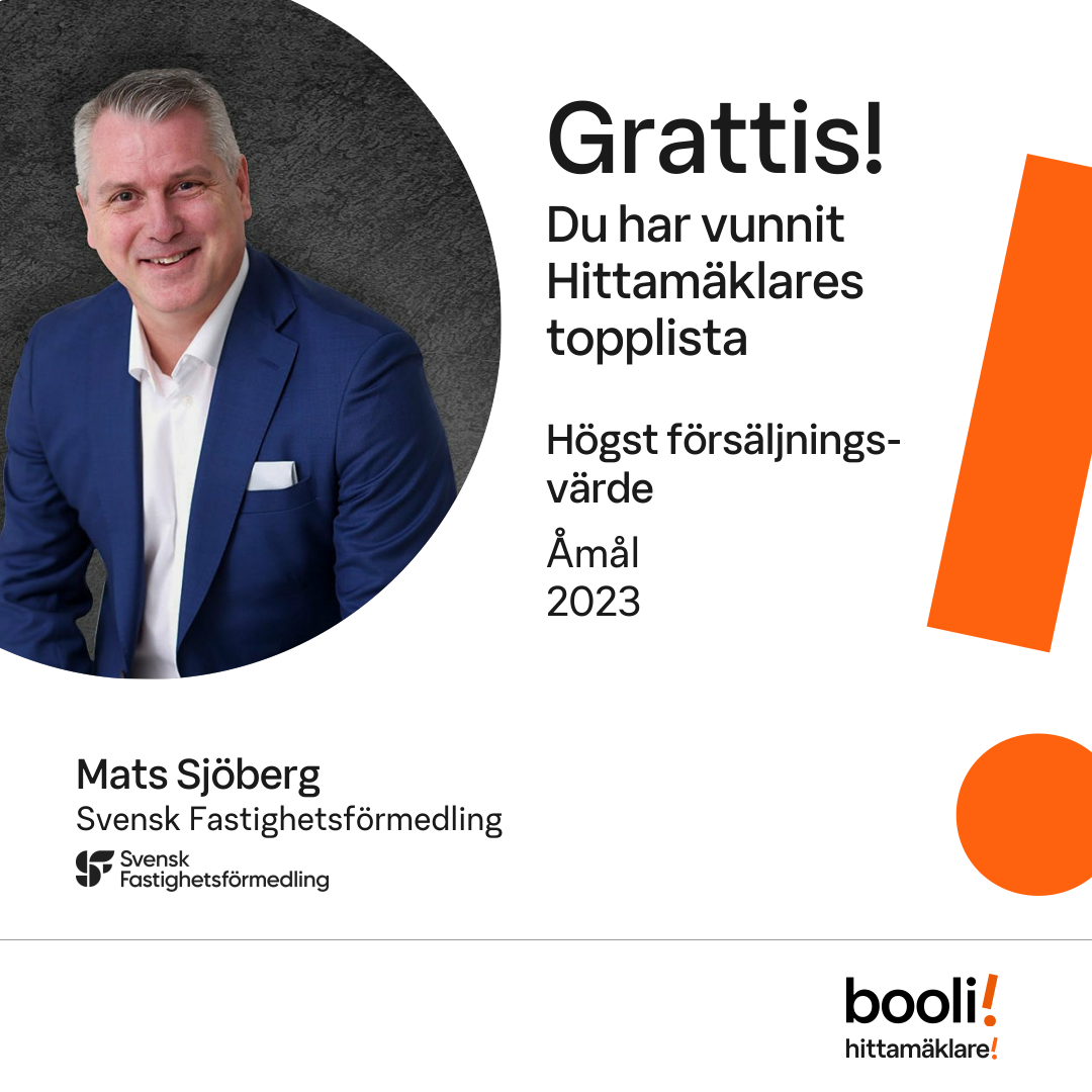 Statistik för publicerade bostäder, försäljningar och omdömen baseras på data från Booli. Statistiken för försäljningar avser inrapporterade och verifierade slutpriser från mäklare eller av Booli inhämtade och verifierade slutpriser. Statistiken för publicerade bostäder baseras på information som publicerats på Booli.se. Statistik för omdömen och rekommendationer baseras på omdömen från säljare som lämnats via Booli.