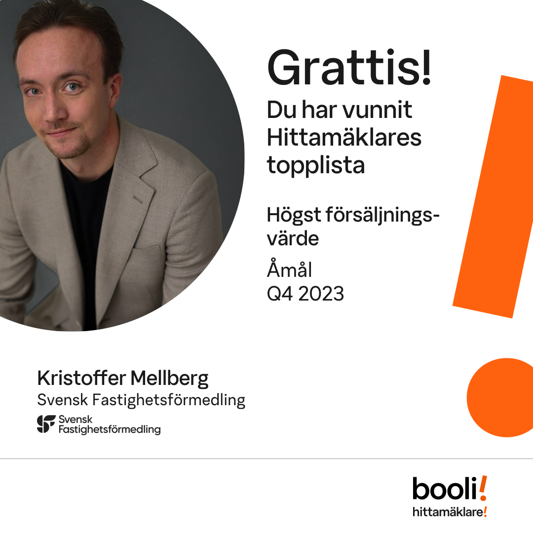 Statistik för publicerade bostäder, försäljningar och omdömen baseras på data från Booli och Hittamäklare. Statistiken för försäljningar avser inrapporterade och verifierade slutpriser från mäklare eller av Booli inhämtade och verifierade slutpriser. Statistiken för publicerade bostäder baseras på information som publicerats på Booli.se. Statistik för omdömen och rekommendationer baseras på omdömen från säljare som lämnats via Booli och Hittamäklare.