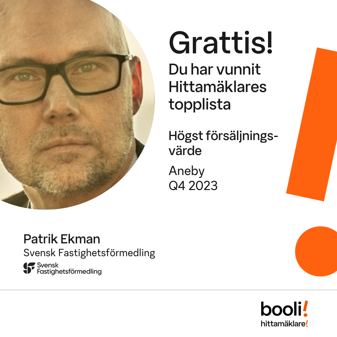 Statistik för publicerade bostäder, försäljningar och omdömen baseras på data från Booli och Hittamäklare. Statistiken för försäljningar avser inrapporterade och verifierade slutpriser från mäklare eller av Booli inhämtade och verifierade slutpriser. Statistiken för publicerade bostäder baseras på information som publicerats på Booli.se. Statistik för omdömen och rekommendationer baseras på omdömen från säljare som lämnats via Booli och Hittamäklare.