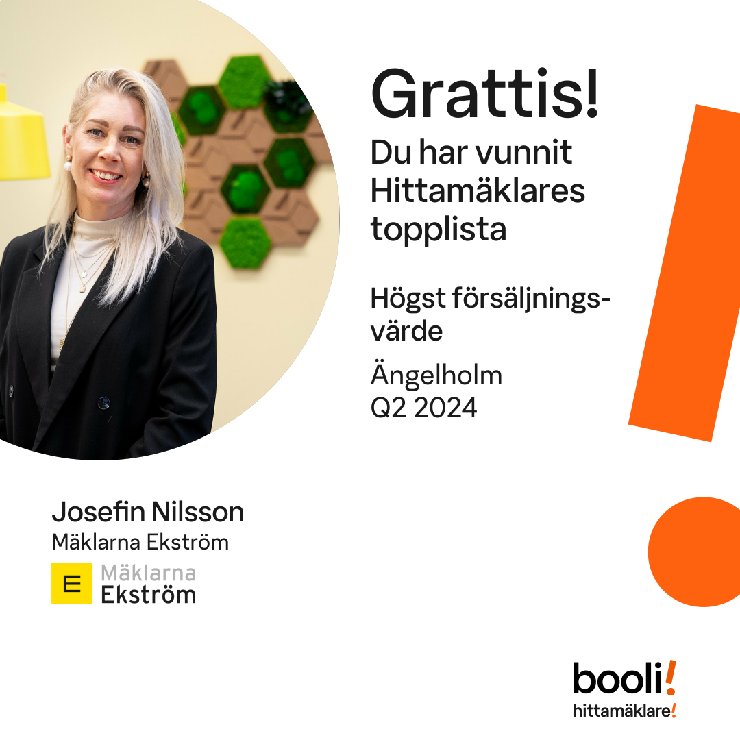 Statistik för publicerade bostäder, försäljningar och omdömen baseras på data från Booli och Hittamäklare. Statistiken för försäljningar avser inrapporterade och verifierade slutpriser från mäklare eller av Booli inhämtade och verifierade slutpriser. Statistiken för publicerade bostäder baseras på information som publicerats på Booli.se. Statistik för omdömen och rekommendationer baseras på omdömen från säljare som lämnats via Booli och Hittamäklare.