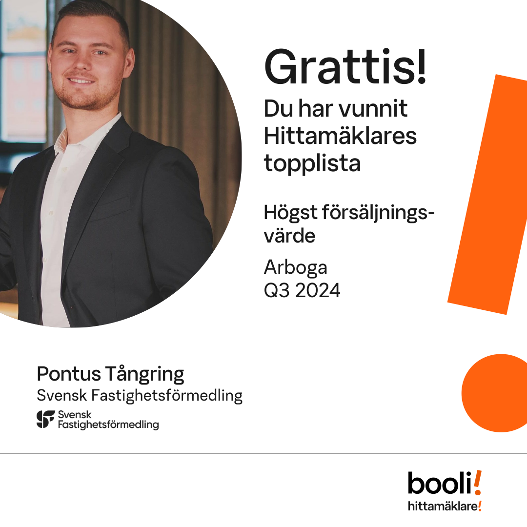 Statistik för publicerade bostäder, försäljningar och omdömen baseras på data från Booli och Hittamäklare. Statistiken för försäljningar avser inrapporterade och verifierade slutpriser från mäklare eller av Booli inhämtade och verifierade slutpriser. Statistiken för publicerade bostäder baseras på information som publicerats på Booli.se. Statistik för omdömen och rekommendationer baseras på omdömen från säljare som lämnats via Booli och Hittamäklare.