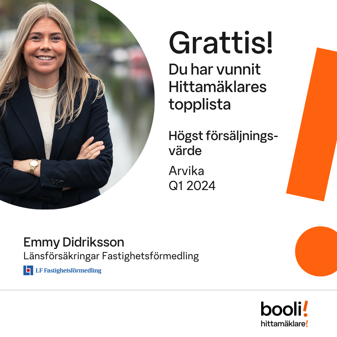 Statistik för publicerade bostäder, försäljningar och omdömen baseras på data från Booli och Hittamäklare. Statistiken för försäljningar avser inrapporterade och verifierade slutpriser från mäklare eller av Booli inhämtade och verifierade slutpriser. Statistiken för publicerade bostäder baseras på information som publicerats på Booli.se. Statistik för omdömen och rekommendationer baseras på omdömen från säljare som lämnats via Booli och Hittamäklare.