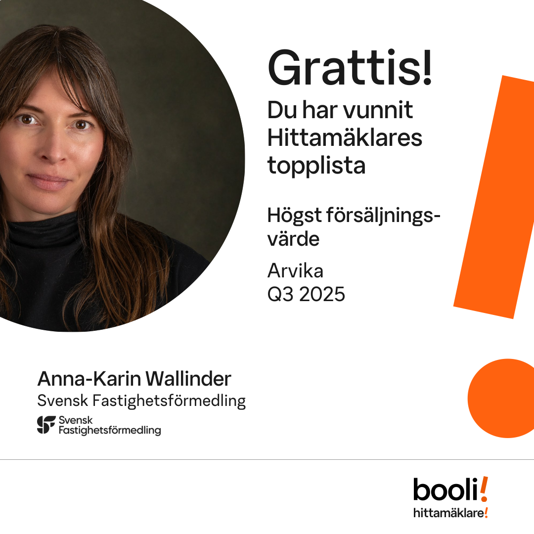 Statistik för publicerade bostäder, försäljningar och omdömen baseras på data från Booli och Hittamäklare. Statistiken för försäljningar avser inrapporterade och verifierade slutpriser från mäklare eller av Booli inhämtade och verifierade slutpriser. Statistiken för publicerade bostäder baseras på information som publicerats på Booli.se. Statistik för omdömen och rekommendationer baseras på omdömen från säljare som lämnats via Booli och Hittamäklare.