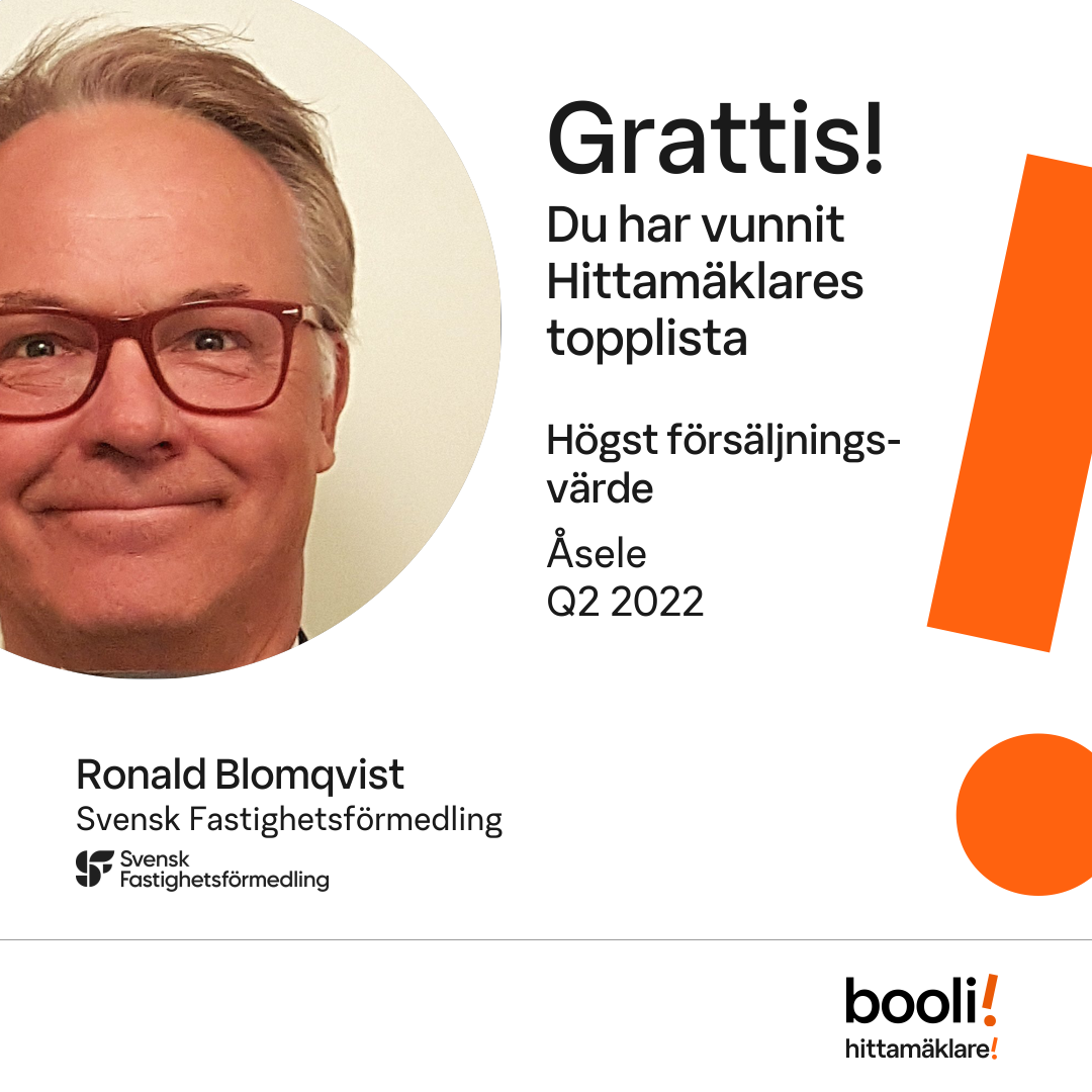 Statistik för publicerade bostäder, försäljningar och omdömen baseras på data från Booli och Hittamäklare. Statistiken för försäljningar avser inrapporterade och verifierade slutpriser från mäklare eller av Booli inhämtade och verifierade slutpriser. Statistiken för publicerade bostäder baseras på information som publicerats på Booli.se. Statistik för omdömen och rekommendationer baseras på omdömen från säljare som lämnats via Booli och Hittamäklare.