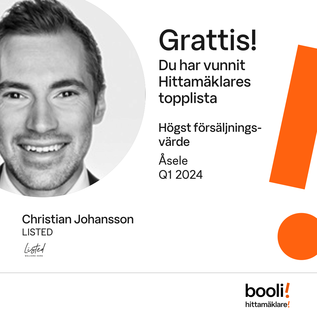 Statistik för publicerade bostäder, försäljningar och omdömen baseras på data från Booli och Hittamäklare. Statistiken för försäljningar avser inrapporterade och verifierade slutpriser från mäklare eller av Booli inhämtade och verifierade slutpriser. Statistiken för publicerade bostäder baseras på information som publicerats på Booli.se. Statistik för omdömen och rekommendationer baseras på omdömen från säljare som lämnats via Booli och Hittamäklare.