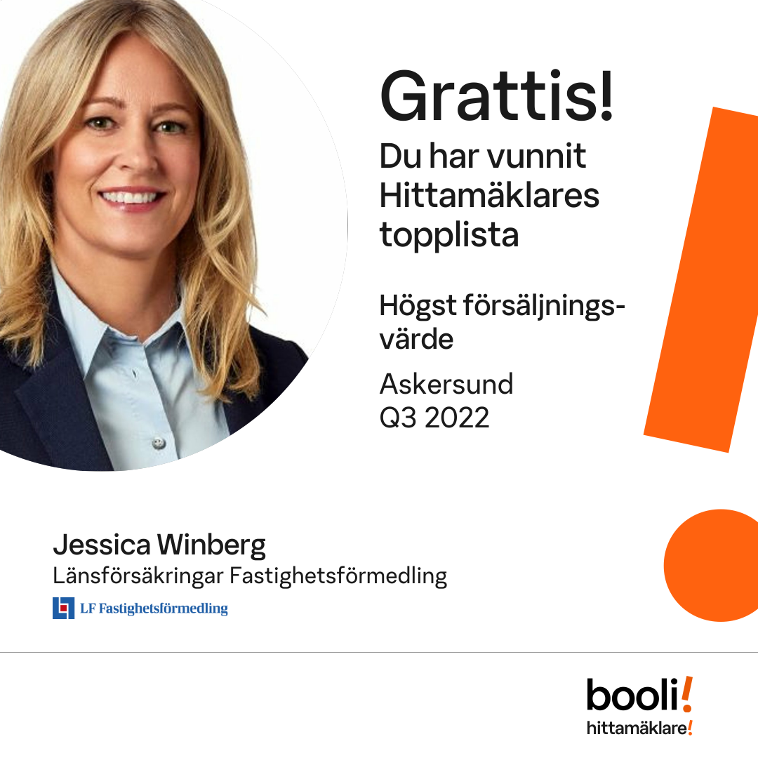 Statistik för publicerade bostäder, försäljningar och omdömen baseras på data från Booli och Hittamäklare. Statistiken för försäljningar avser inrapporterade och verifierade slutpriser från mäklare eller av Booli inhämtade och verifierade slutpriser. Statistiken för publicerade bostäder baseras på information som publicerats på Booli.se. Statistik för omdömen och rekommendationer baseras på omdömen från säljare som lämnats via Booli och Hittamäklare.