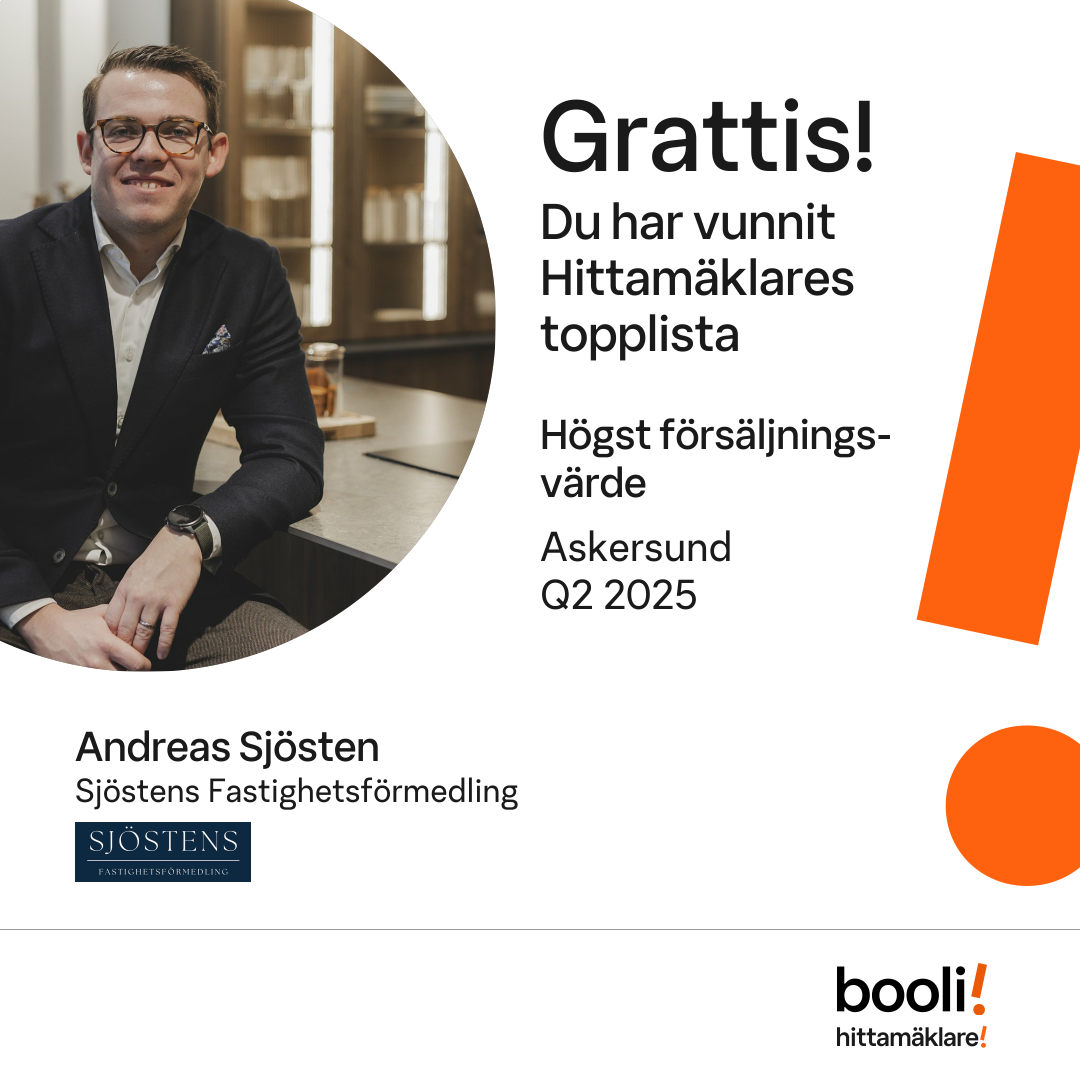 Statistik för publicerade bostäder, försäljningar och omdömen baseras på data från Booli och Hittamäklare. Statistiken för försäljningar avser inrapporterade och verifierade slutpriser från mäklare eller av Booli inhämtade och verifierade slutpriser. Statistiken för publicerade bostäder baseras på information som publicerats på Booli.se. Statistik för omdömen och rekommendationer baseras på omdömen från säljare som lämnats via Booli och Hittamäklare.