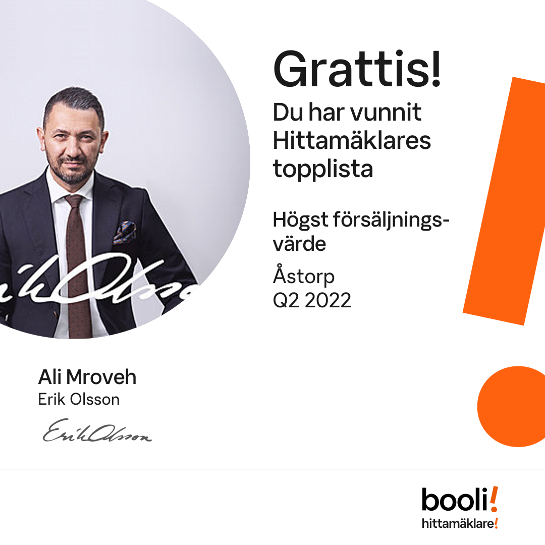 Statistik för publicerade bostäder, försäljningar och omdömen baseras på data från Booli och Hittamäklare. Statistiken för försäljningar avser inrapporterade och verifierade slutpriser från mäklare eller av Booli inhämtade och verifierade slutpriser. Statistiken för publicerade bostäder baseras på information som publicerats på Booli.se. Statistik för omdömen och rekommendationer baseras på omdömen från säljare som lämnats via Booli och Hittamäklare.