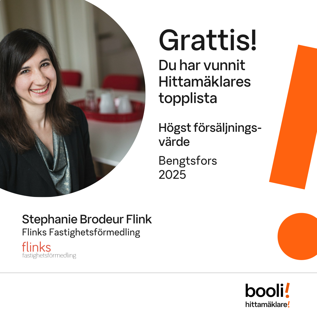 Statistik för publicerade bostäder, försäljningar och omdömen baseras på data från Booli och Hittamäklare. Statistiken för försäljningar avser inrapporterade och verifierade slutpriser från mäklare eller av Booli inhämtade och verifierade slutpriser. Statistiken för publicerade bostäder baseras på information som publicerats på Booli.se. Statistik för omdömen och rekommendationer baseras på omdömen från säljare som lämnats via Booli och Hittamäklare.