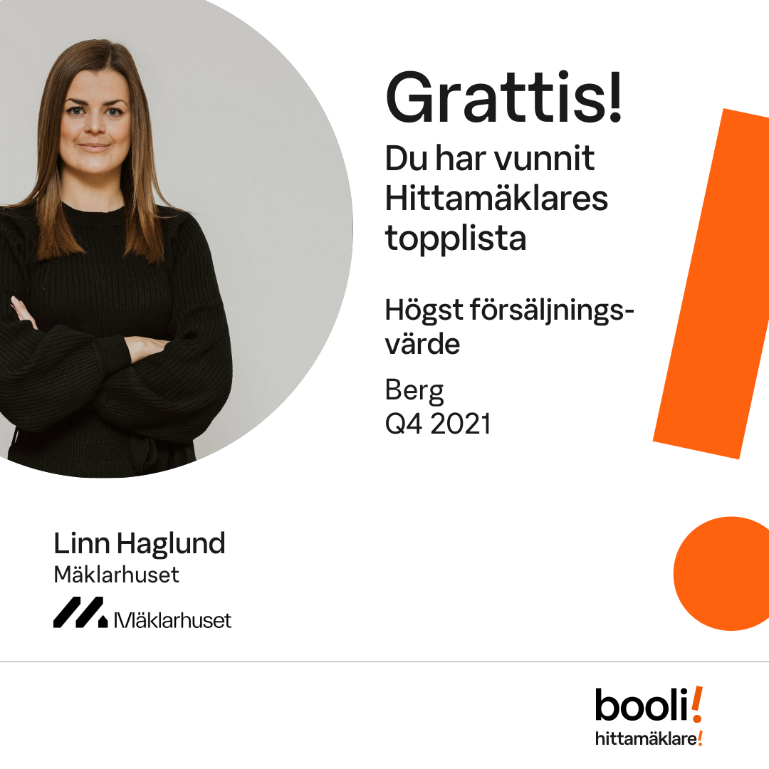 Statistik för publicerade bostäder, försäljningar och omdömen baseras på data från Booli och Hittamäklare. Statistiken för försäljningar avser inrapporterade och verifierade slutpriser från mäklare eller av Booli inhämtade och verifierade slutpriser. Statistiken för publicerade bostäder baseras på information som publicerats på Booli.se. Statistik för omdömen och rekommendationer baseras på omdömen från säljare som lämnats via Booli och Hittamäklare.