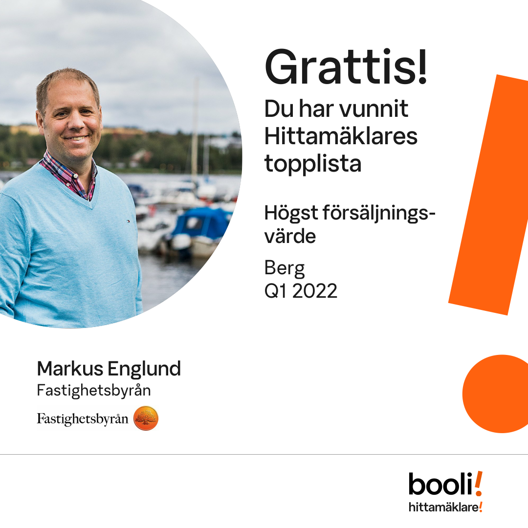 Statistik för publicerade bostäder, försäljningar och omdömen baseras på data från Booli och Hittamäklare. Statistiken för försäljningar avser inrapporterade och verifierade slutpriser från mäklare eller av Booli inhämtade och verifierade slutpriser. Statistiken för publicerade bostäder baseras på information som publicerats på Booli.se. Statistik för omdömen och rekommendationer baseras på omdömen från säljare som lämnats via Booli och Hittamäklare.