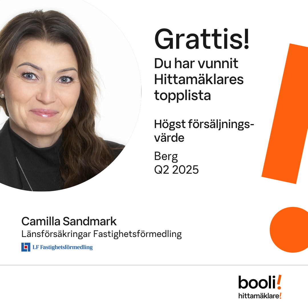 Statistik för publicerade bostäder, försäljningar och omdömen baseras på data från Booli och Hittamäklare. Statistiken för försäljningar avser inrapporterade och verifierade slutpriser från mäklare eller av Booli inhämtade och verifierade slutpriser. Statistiken för publicerade bostäder baseras på information som publicerats på Booli.se. Statistik för omdömen och rekommendationer baseras på omdömen från säljare som lämnats via Booli och Hittamäklare.
