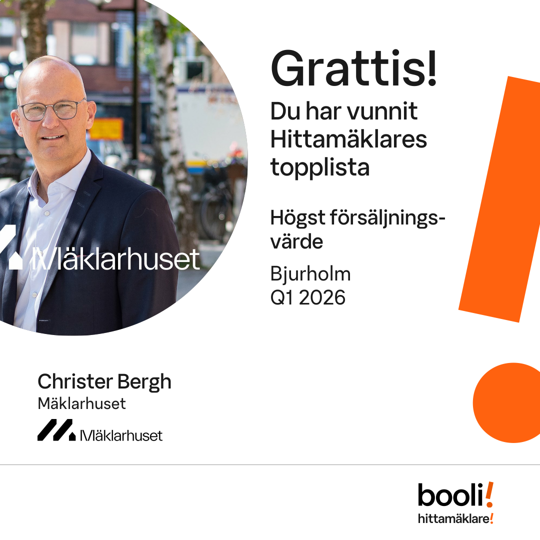 Statistik för publicerade bostäder, försäljningar och omdömen baseras på data från Booli. Statistiken för försäljningar avser inrapporterade och verifierade slutpriser från mäklare eller av Booli inhämtade och verifierade slutpriser. Statistiken för publicerade bostäder baseras på information som publicerats på Booli.se. Statistik för omdömen och rekommendationer baseras på omdömen från säljare som lämnats via Booli.