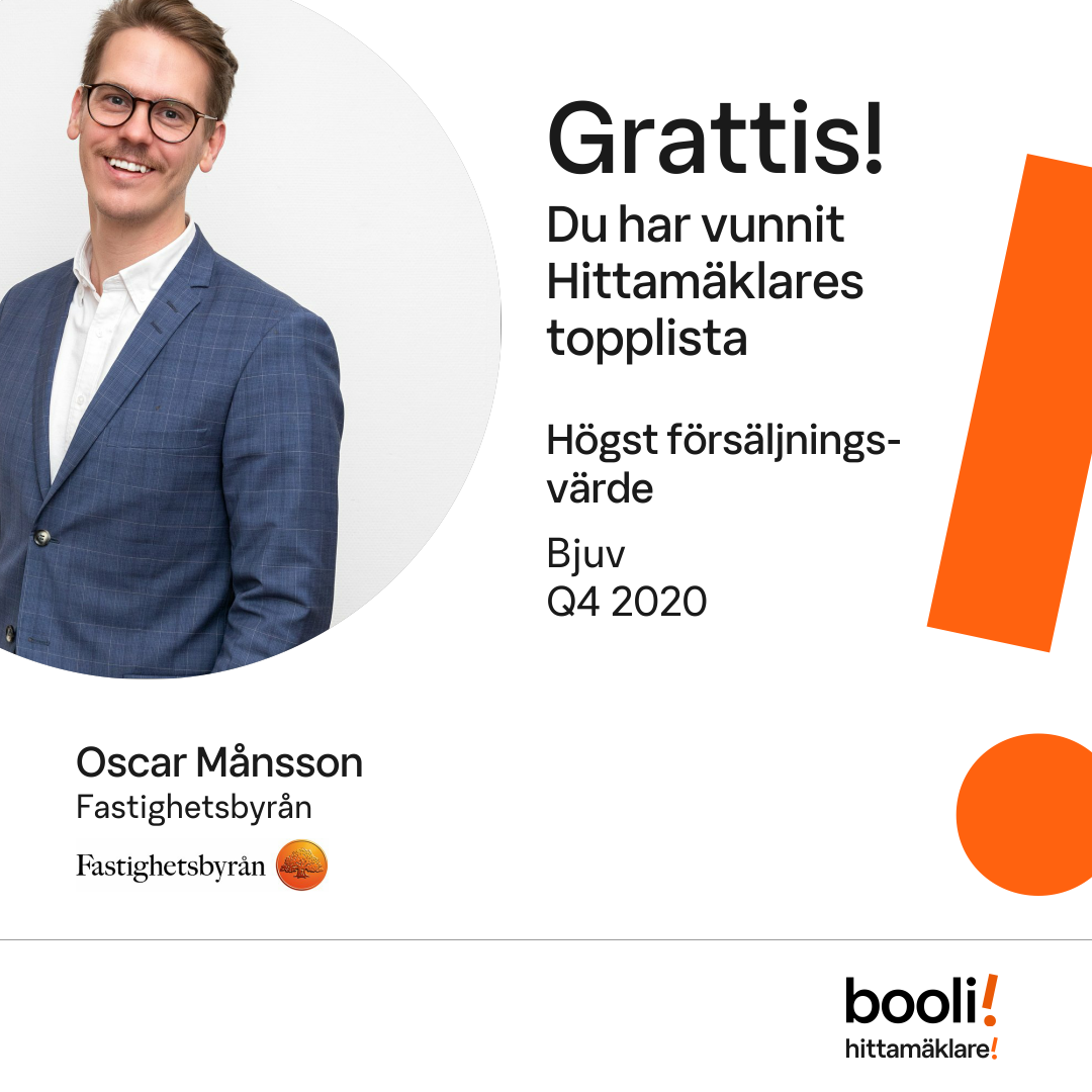 Statistik för publicerade bostäder, försäljningar och omdömen baseras på data från Booli och Hittamäklare. Statistiken för försäljningar avser inrapporterade och verifierade slutpriser från mäklare eller av Booli inhämtade och verifierade slutpriser. Statistiken för publicerade bostäder baseras på information som publicerats på Booli.se. Statistik för omdömen och rekommendationer baseras på omdömen från säljare som lämnats via Booli och Hittamäklare.