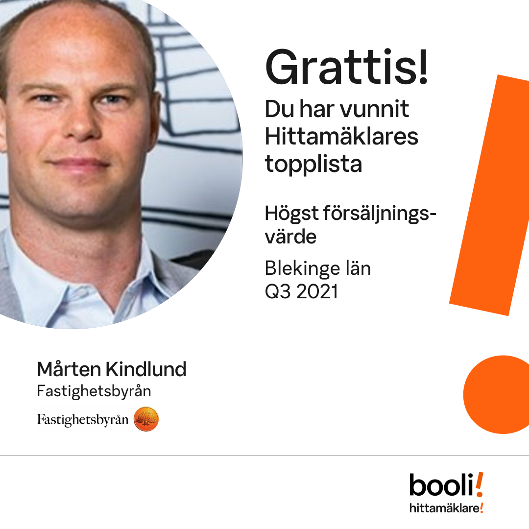 Statistik för publicerade bostäder, försäljningar och omdömen baseras på data från Booli och Hittamäklare. Statistiken för försäljningar avser inrapporterade och verifierade slutpriser från mäklare eller av Booli inhämtade och verifierade slutpriser. Statistiken för publicerade bostäder baseras på information som publicerats på Booli.se. Statistik för omdömen och rekommendationer baseras på omdömen från säljare som lämnats via Booli och Hittamäklare.