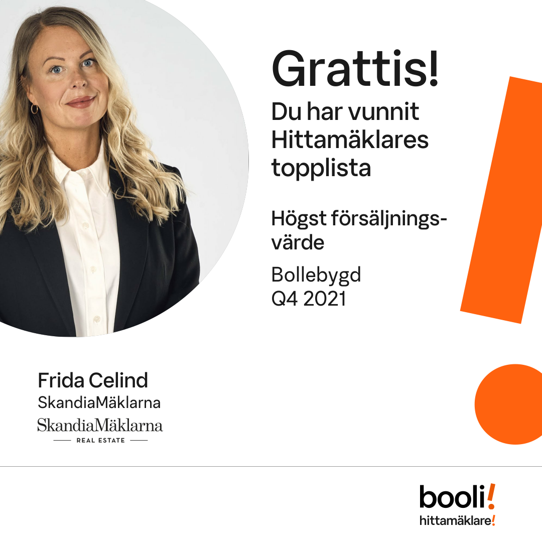 Statistik för publicerade bostäder, försäljningar och omdömen baseras på data från Booli och Hittamäklare. Statistiken för försäljningar avser inrapporterade och verifierade slutpriser från mäklare eller av Booli inhämtade och verifierade slutpriser. Statistiken för publicerade bostäder baseras på information som publicerats på Booli.se. Statistik för omdömen och rekommendationer baseras på omdömen från säljare som lämnats via Booli och Hittamäklare.