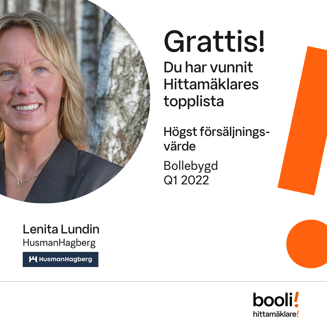 Statistik för publicerade bostäder, försäljningar och omdömen baseras på data från Booli och Hittamäklare. Statistiken för försäljningar avser inrapporterade och verifierade slutpriser från mäklare eller av Booli inhämtade och verifierade slutpriser. Statistiken för publicerade bostäder baseras på information som publicerats på Booli.se. Statistik för omdömen och rekommendationer baseras på omdömen från säljare som lämnats via Booli och Hittamäklare.